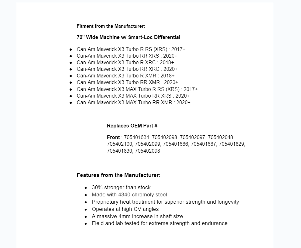 When you’re rolling around on your Can-Am Maverick X3, you can tell that thing is powerful. It rolls through ditches and over logs easily… at least until you blow an axle. SuperATV’s Rhino 2.0 Axles are made specifically for your X3, and are better, stronger axles that keep you moving forward no matter what. Ride confidently on Rhino 2.0.