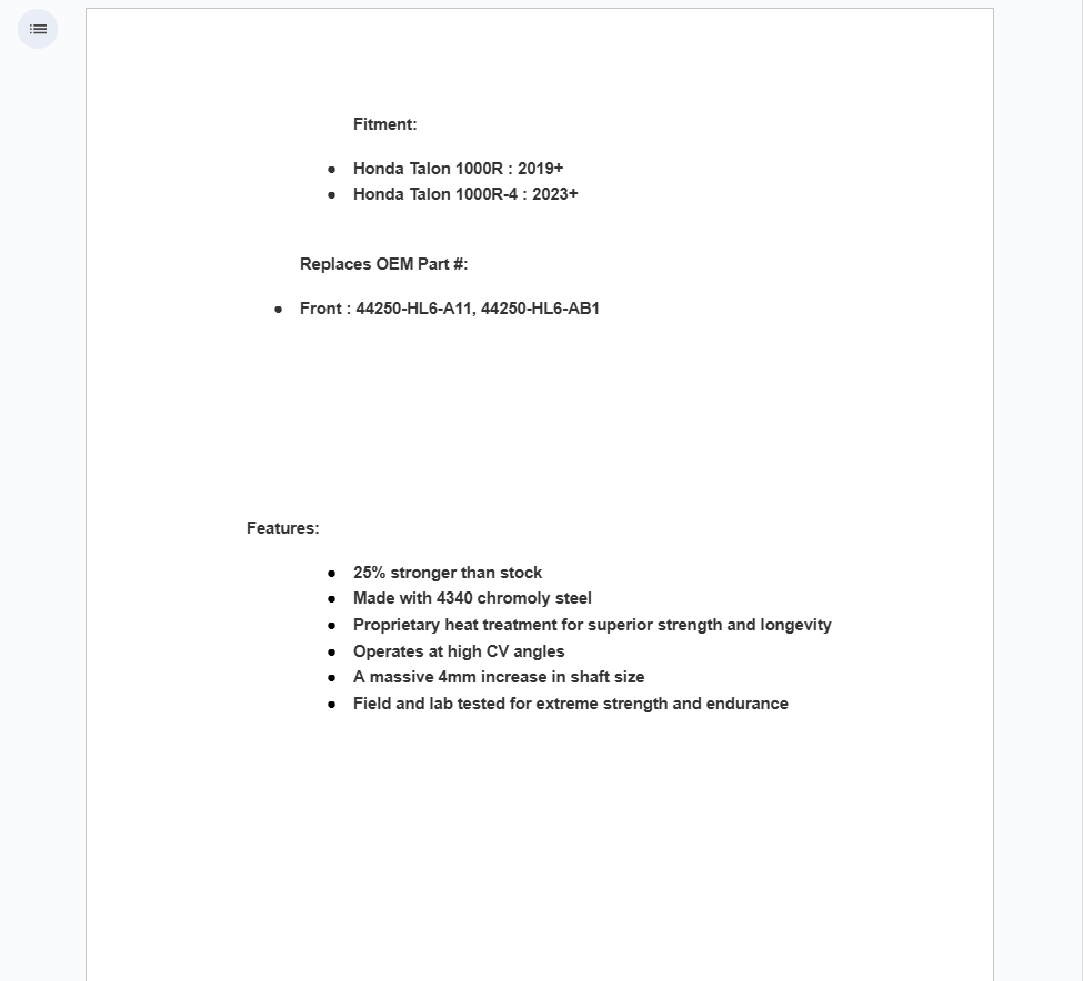 The axles on your Talon 1000R take a beating. Every bump, every turn, and every pedal-down moment takes your stock axles one step closer to falling apart. At SuperATV, we have a better, stronger axle. Replace or upgrade your OEM axles to Heavy-Duty Rhino 2.0 Axles on your Talon, and ride confidently knowing that these axles will last you for years.