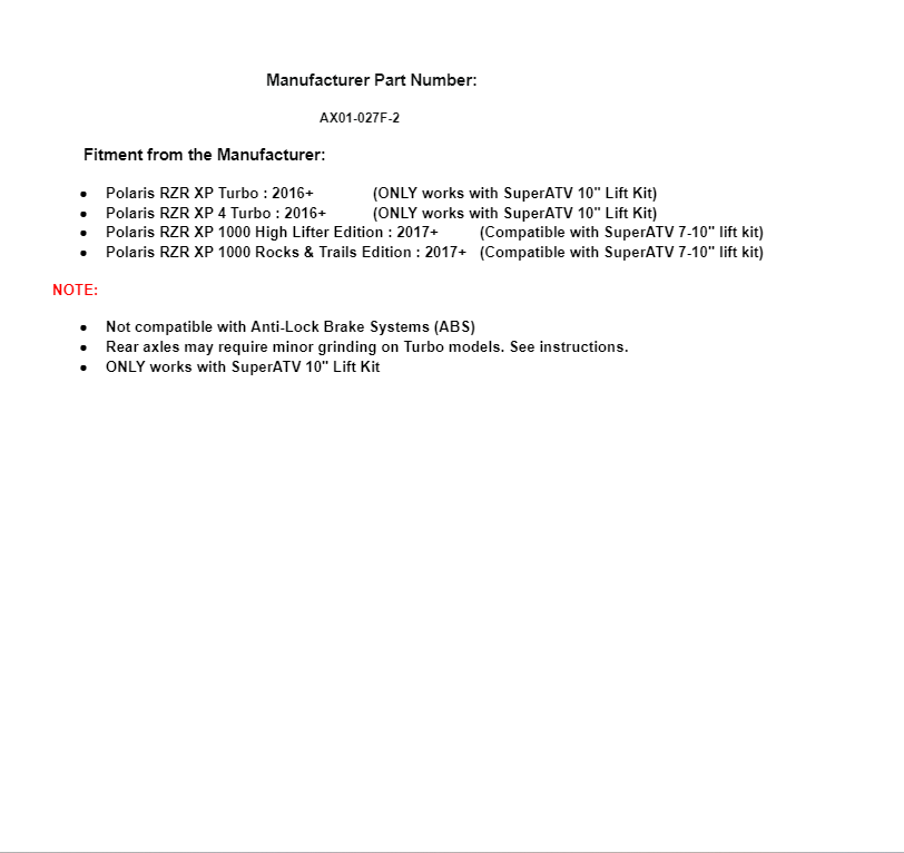 - Polaris RZR XP Turbo : 2016+ (ONLY works with SuperATV 10″ Lift Kit)