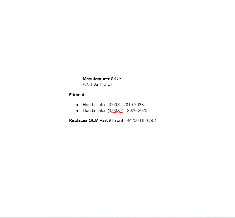 | Honda | Talon 1000X | SXS10S2XD FOX Live Valve | 2022 | |