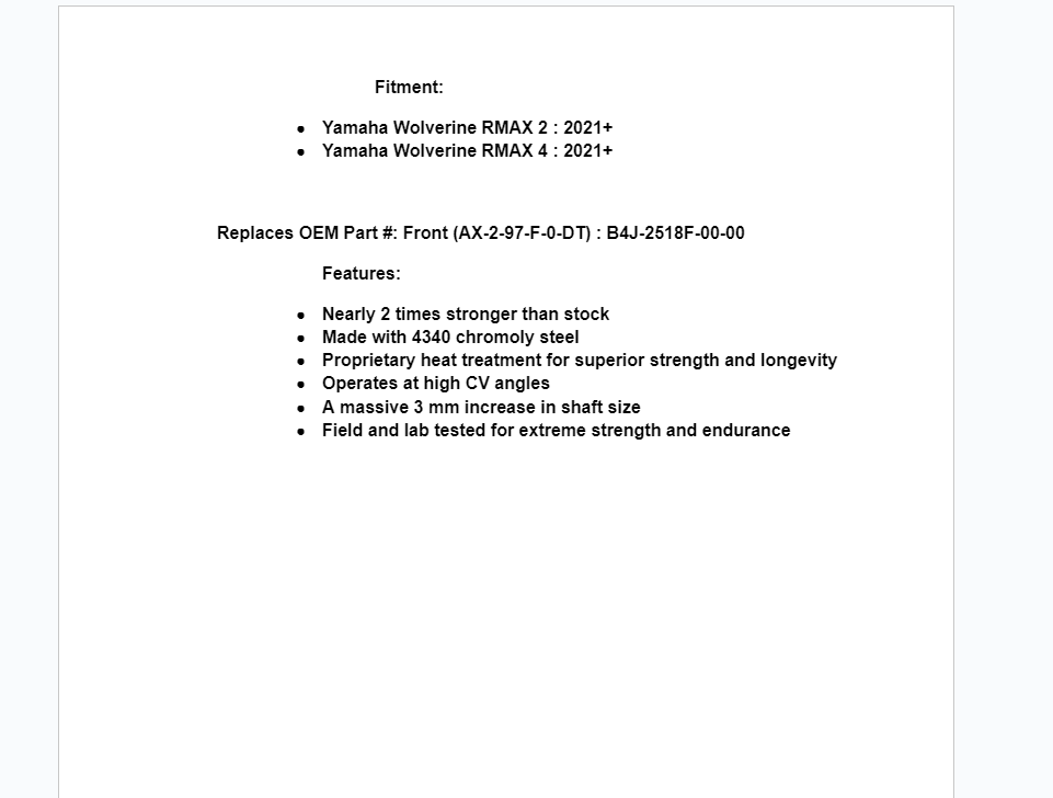 SuperATV Rhino 2.0 Heavy Duty Front Axle For Yamaha Wolverine RMAX 2/4 1000
