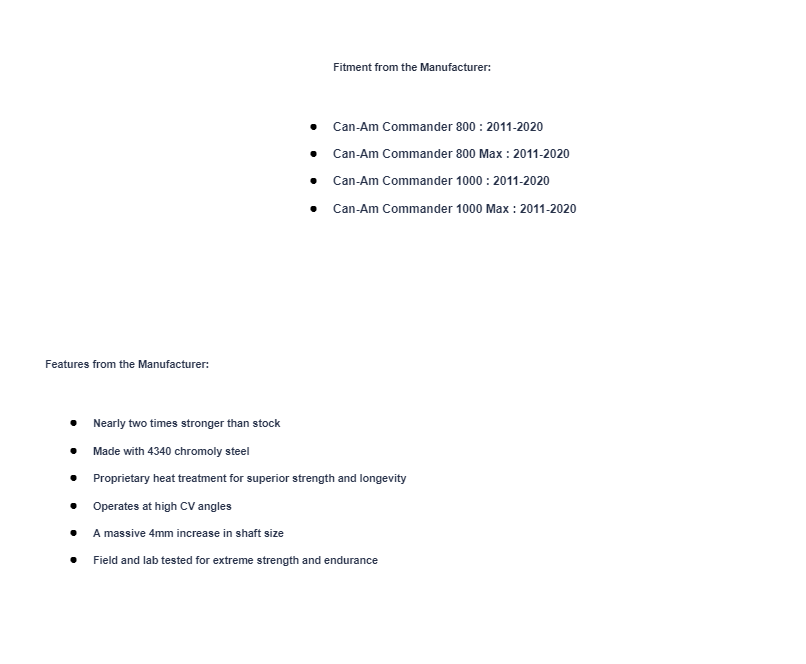 When you lay on the gas in your Can-Am Commander, you’re pushing all that horsepower straight to the ground. That’s a ton of stress on your axles, and your stock ones tend to fail when things get sketchy. That’s why we made Rhino 2.0 Axles. They’re designed to go where your stock axles can’t. They’re nearly two times stronger than stock and they’ll get you to your destination no matter what.