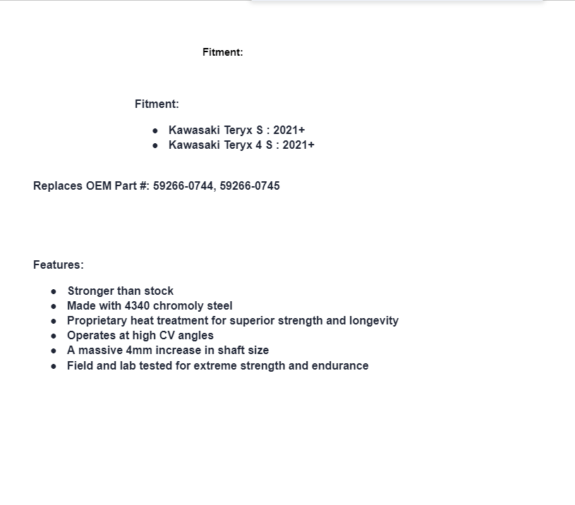 Your Kawasaki Teryx S shines on the trails, the job site, and everywhere in between. But that much versatility requires something stronger than stock, especially when it comes to your axles. So when it’s time to upgrade, go with heavy-duty Rhino 2.0 Axles from SuperATV. They’re stronger than stock so you can ride longer and harder than ever before.