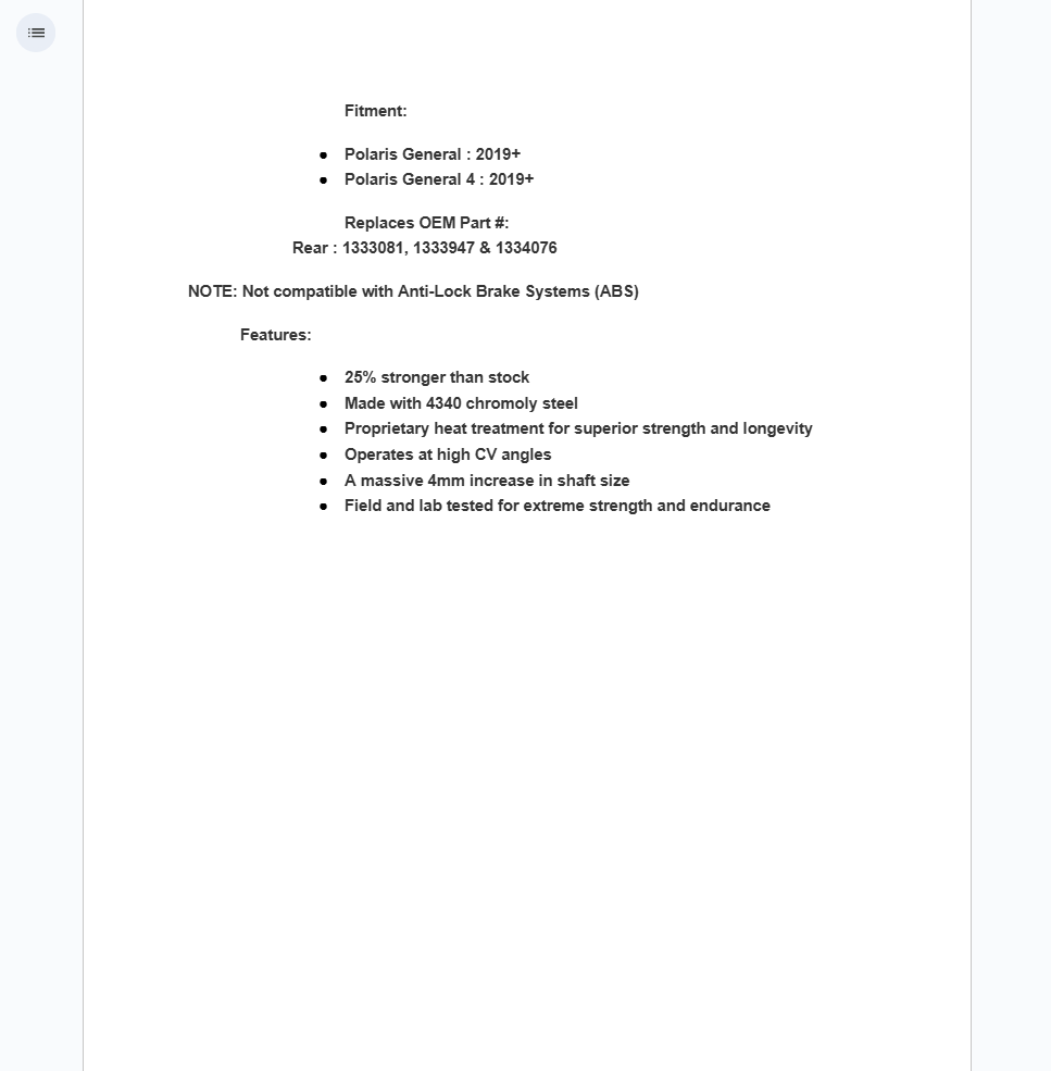 When you buy from us, you’re buying real SuperATV axles from the guys and girls that designed, engineered, tested, and manufactured Rhino 2.0. Our top-of-the-line test lab pits stock axles against our design so we can ensure they’re 25% stronger than stock Polaris General axles, and we’ve taken them from coast to coast to prove that they can handle any riding conditions and years of hard riding.