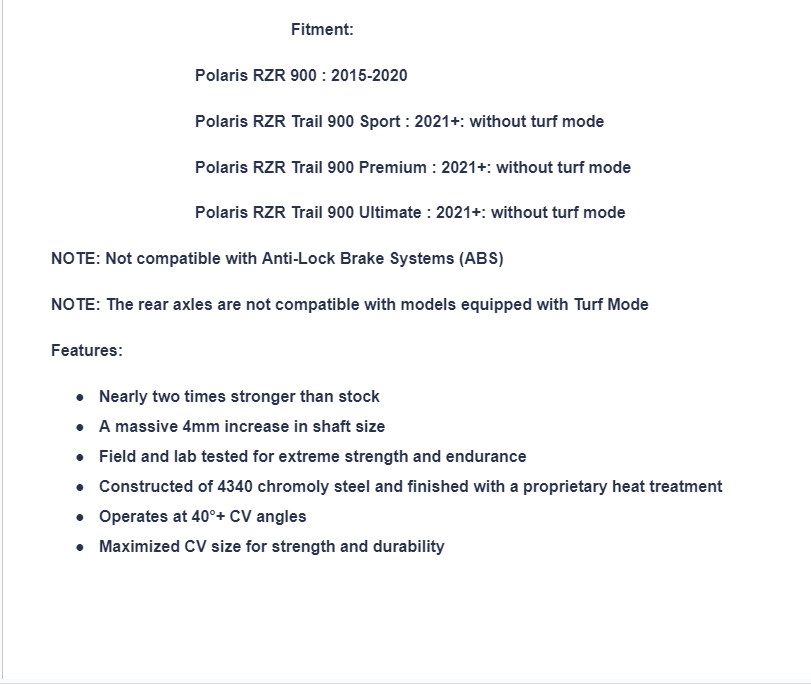 When you lay on the gas in your Polaris RZR 900, you’re pushing all that horsepower straight to the ground. That’s a ton of stress on your axles, and your stock ones tend to fail when things get sketchy. That’s why we made Rhino 2.0 Axles. They’re designed to go where your stock axles can’t. They’re nearly two times stronger than stock and they’ll get you to your destination no matter what.