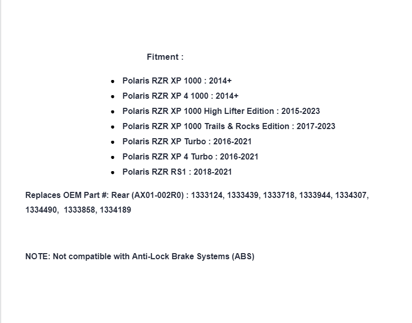 Replaces OEM Part #: Rear (AX01-002R0) : 1333124, 1333439, 1333718, 1333944, 1334307, 1334490, 1333858, 1334189
