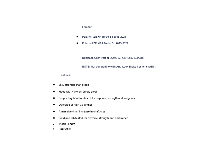 When you’re rolling around on your RZR XP Turbo S, you can tell that thing is powerful. It rolls through ditches and over logs easily… at least until you blow an axle. SuperATV’s Rhino 2.0 Axles are made specifically for your Turbo S, and are better, stronger axles that keep you moving forward no matter what. Ride confidently on Rhino 2.0.