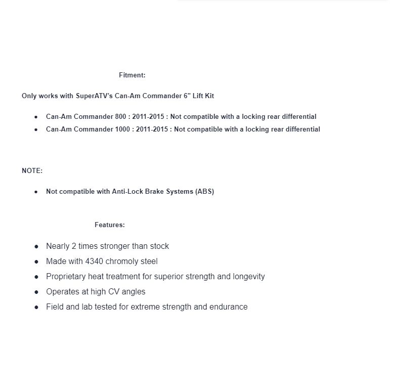 - Rear Axles do not fit Commander 800/1000 models with a locking rear differential.
