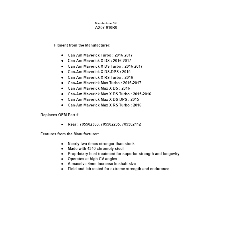 If you want to hit the trail without the trail hitting back, you need SuperATV Rhino 2.0 Axles on your Can-Am Maverick Turbo. It’s nearly two times stronger than stock so you can get through harder trails with the pedal floored. Between high articulation angles and all chromoly construction, they’re designed to take your RZR anywhere you want, any way you want. They roll where stock snaps.