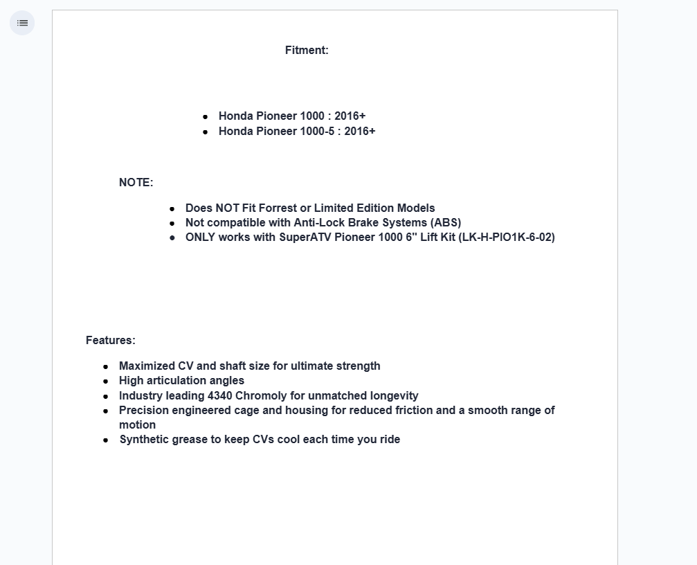 These lift kit axles are designed specifically for the SuperATV Honda Pioneer 6” lift kit to give you the strongest, and most reliable lift possible.