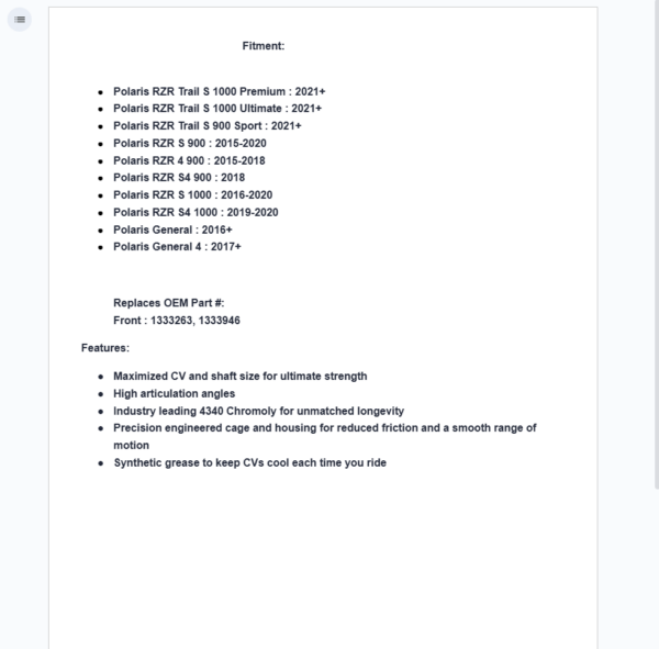 When you ride, you don’t want to worry about your Polaris RZR Trail S 1000’s components. That’s why blowing your stock axle is so disappointing. Replace stock with SuperATV’s Rhino Brand Axles. They have higher articulation angles and a beefier shaft for long-lasting reliability. These axles are designed not to disappoint.