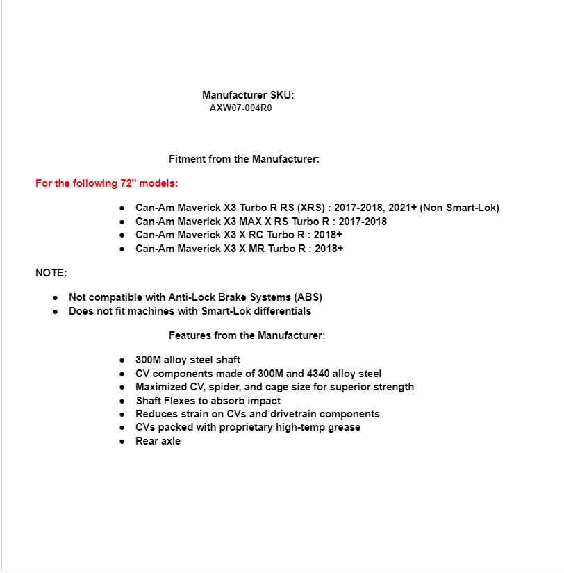 - Can-Am Maverick X3 Turbo R RS (XRS) : 2017-2018, 2021+ (Non Smart-Lok)