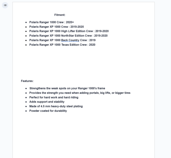 - Strengthens the weak spots on your Ranger 1000’s frame