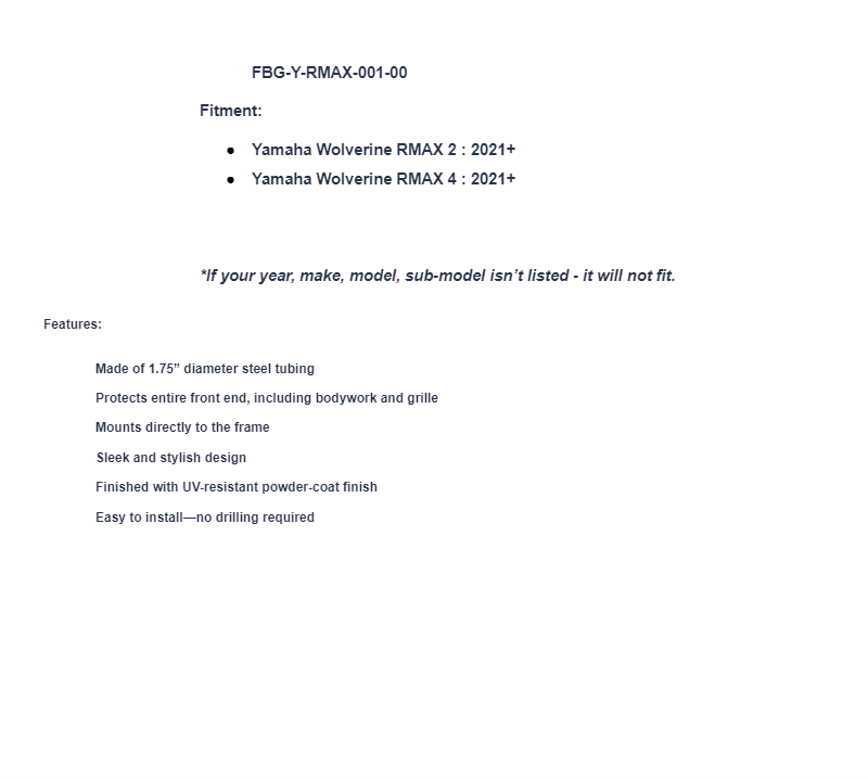 Adding this Yamaha bumper to your machine takes a load of work off of you. You no longer have to oversteer to try and avoid every limb you almost come in contact with. We’ve made the tubing from heavy-duty 1.75” diameter steel. It’s hand-welded and cleverly designed for the best protection. Plus, it bolts directly to your frame for an exceptionally solid mount. After installing this bumper to your rig, the trails aren’t going to know what hit them.