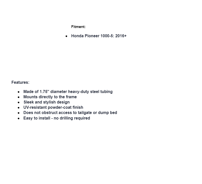 Our brawny rear bumper is just what your Pioneer 1000 needs to stand out. It gives you a bold look that tells every approaching rider to back off—a fender bender will do more damage to their machine than yours.