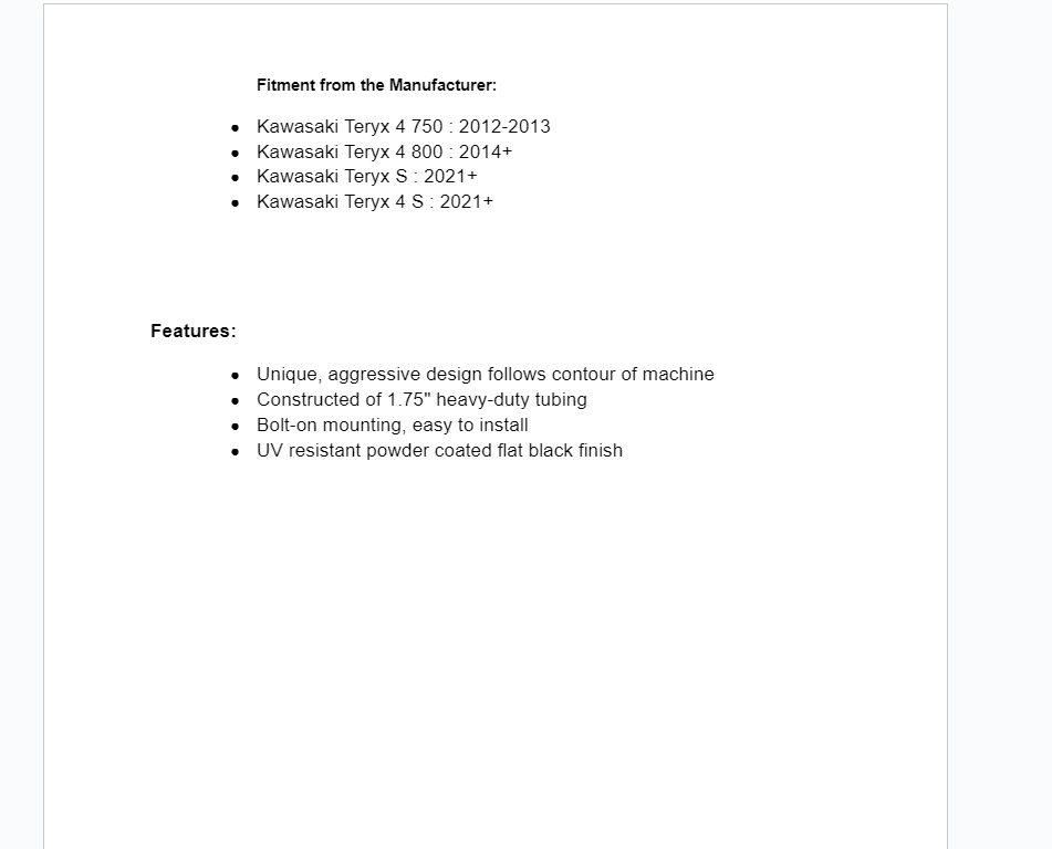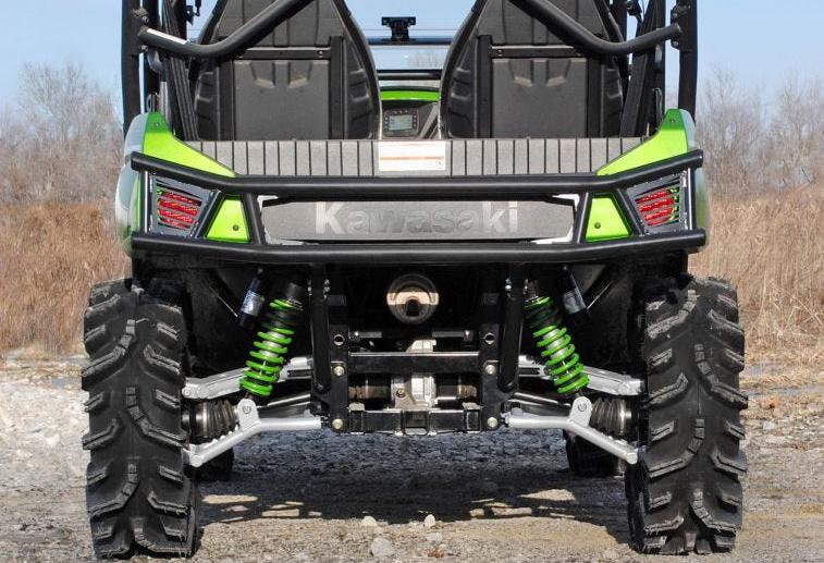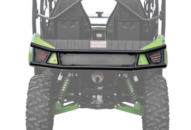 Customize your Kawasaki Teryx 4 with a rear bumper from SuperATV. This unique and aggressive design is carefully crafted to follow the contour of your machine. It provides a sleek and stylish look while giving you ultimate protection for your tail lights, exhaust, and bed. This rugged bumper features a UV resistant, powder coated finish that’s long lasting and compliments the cage and body. Constructed of 1.75 heavy-duty tubing, its bolt-on mounting style is easy to install and includes all necessary hardware and instructions.