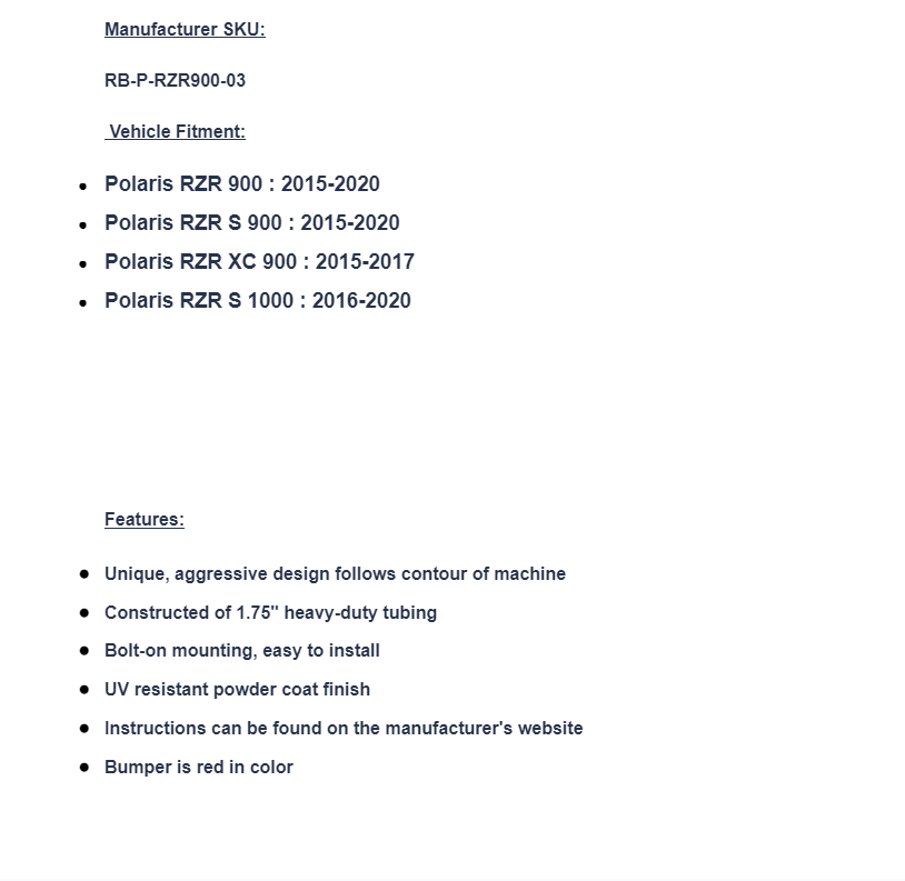 Customize your RZR 900 with a rear bumper from SuperATV. This unique and aggressive design is carefully crafted to follow the contour of your machine. It provides a sleek and stylish look while giving you ultimate protection for your tail lights, exhaust, and bed. This rugged bumper features a UV resistant, powder coated finish that’s long lasting and compliments the cage and body. Multiple colors are available to match your machine. Constructed of 1.75″ heavy-duty tubing, its bolt-on mounting style is easy to install.