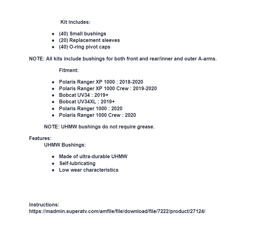 All A-arm bushings need replaced eventually. And the harder you ride, the faster they’ll wear out. So why not go for a replacement that’s going to last longer than the one you started with? SuperATV’s A-Arm Bushings keep your Polaris Ranger XP 1000 running smoother for longer. Long-lasting UHMW bushings, you’re getting quality and strength you won’t find anywhere else.