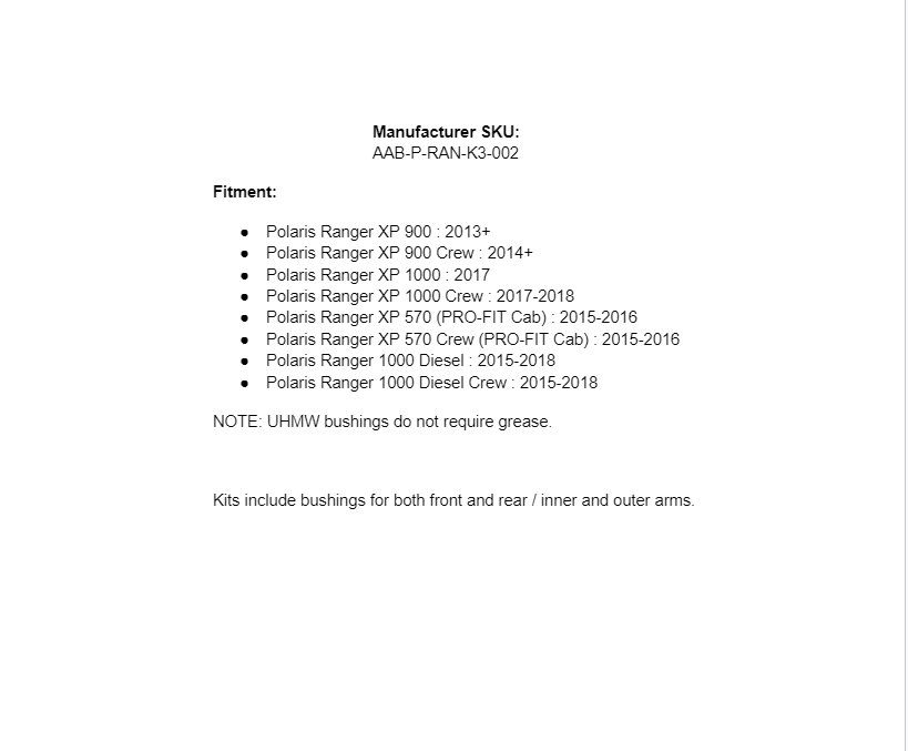 | Model | Kits include bushings for both front and rear / inner and outer arms. |