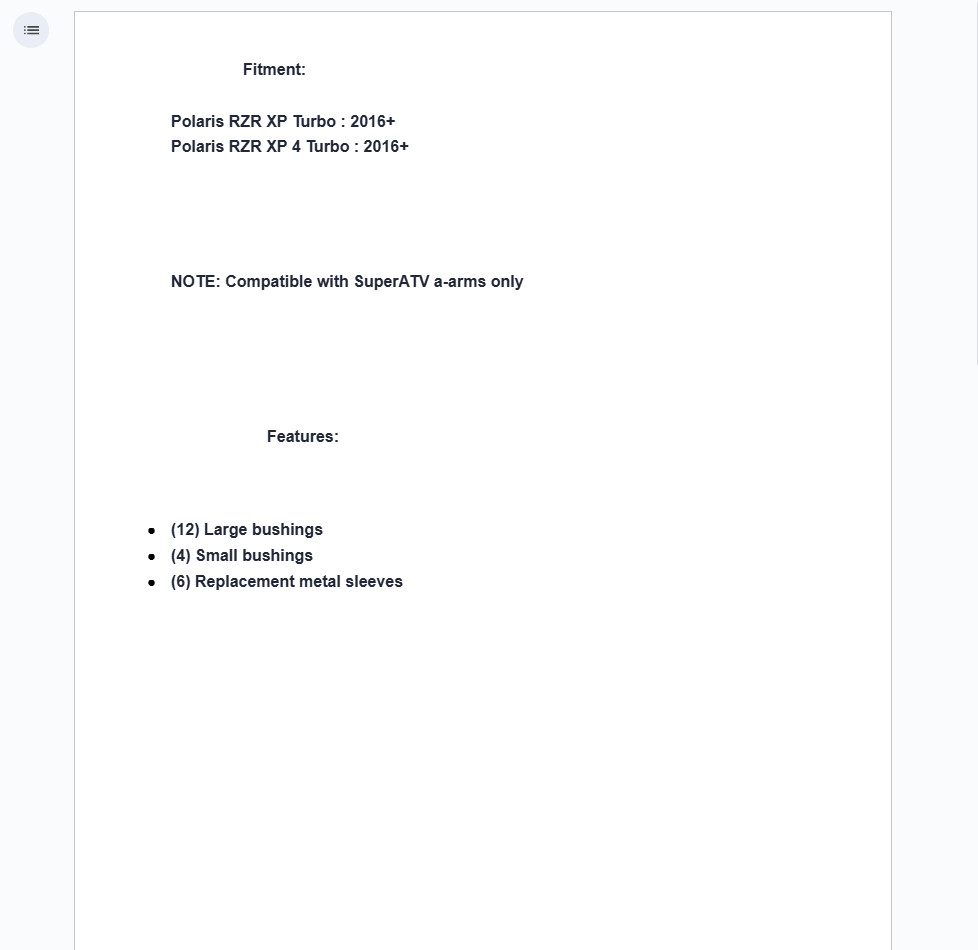 | Features | (12) Large bushings (4) Small bushings (6) Replacement metal sleeves |