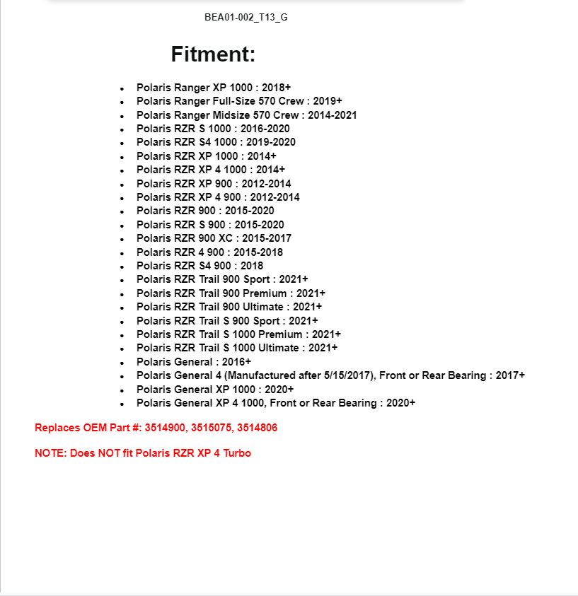 - Polaris General 4 (Manufactured after 5/15/2017), Front or Rear Bearing : 2017+