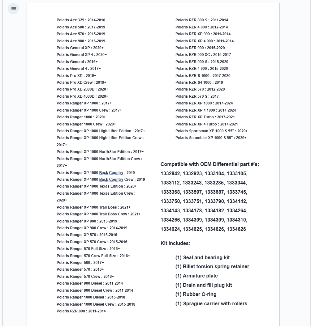 Compatible with OEM Differential part #’s: 1332842, 1332923, 1333104, 1333105, 1333112, 1333243, 1333285, 1333344, 1333368, 1333597, 1333687, 1333745, 1333750, 1333751, 1333790, 1334142, 1334143, 1334178, 1334182, 1334264, 1334266, 1334309, 1334309, 1334310, 1334624, 1334625, 1334626, 1334626 that MAY be found in some: