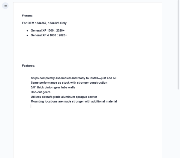 We put hardened hob-cut gears in our Polaris General XP 1000 front differential. Why does that matter? Hobbed gears mate precisely to ensure your front diff runs with little noise and vibration. That means a more pleasant ride for you and better durability for your diff.