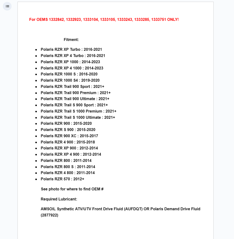 - Polaris RZR 800 : 2011-2014