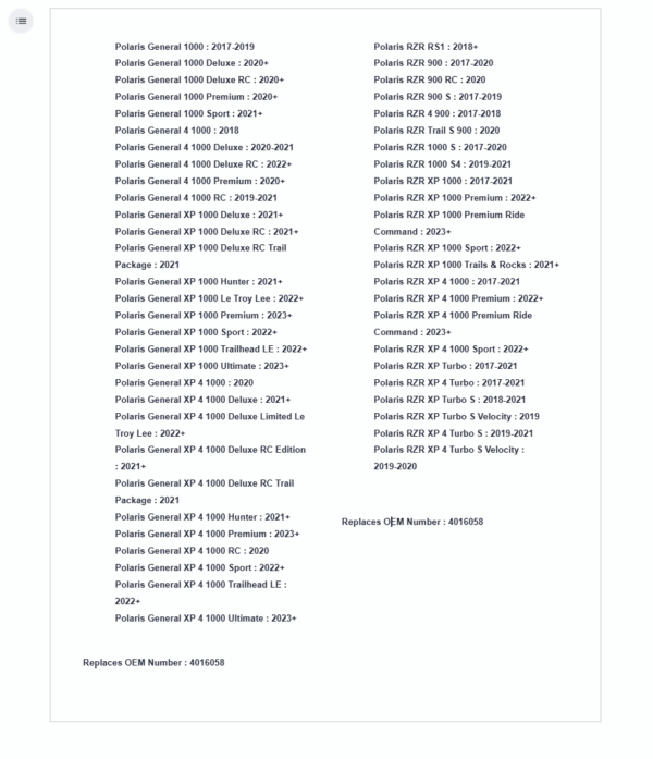 | Polaris | General XP 1000 | Deluxe | 2022 | 1333790, 1334142, 1334178, 1334625 |