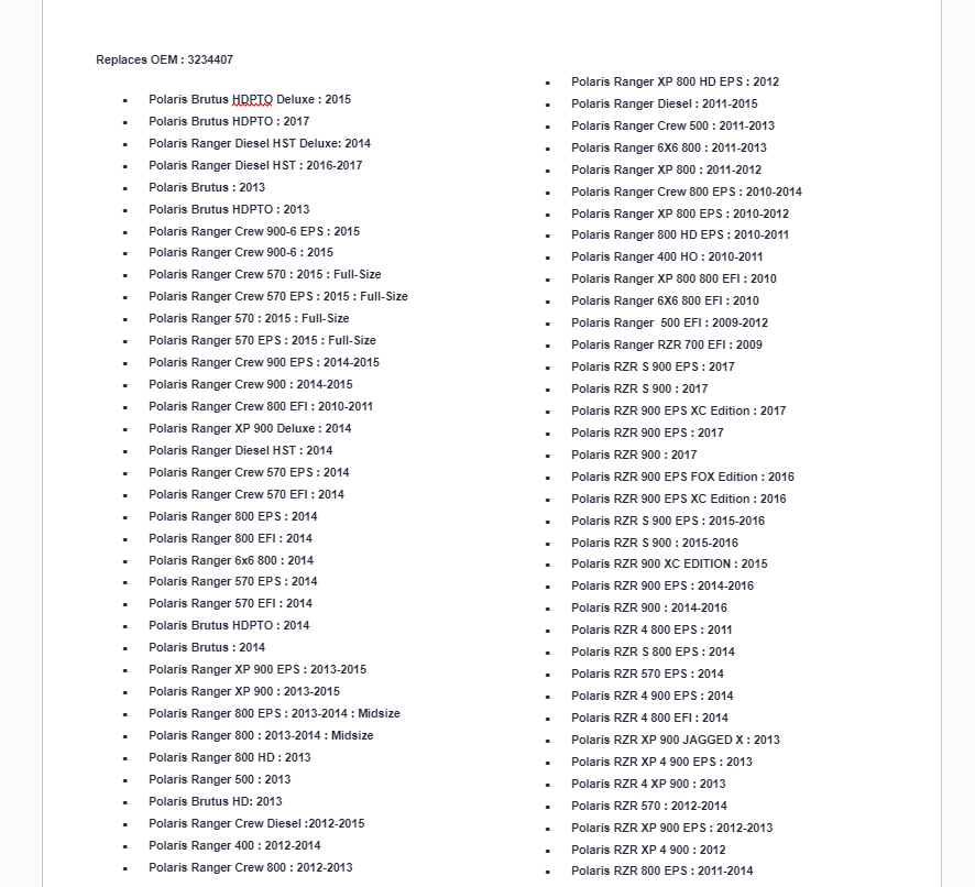 | Polaris | Ranger 800 | Midsize EFI | 2014 | Midsize |