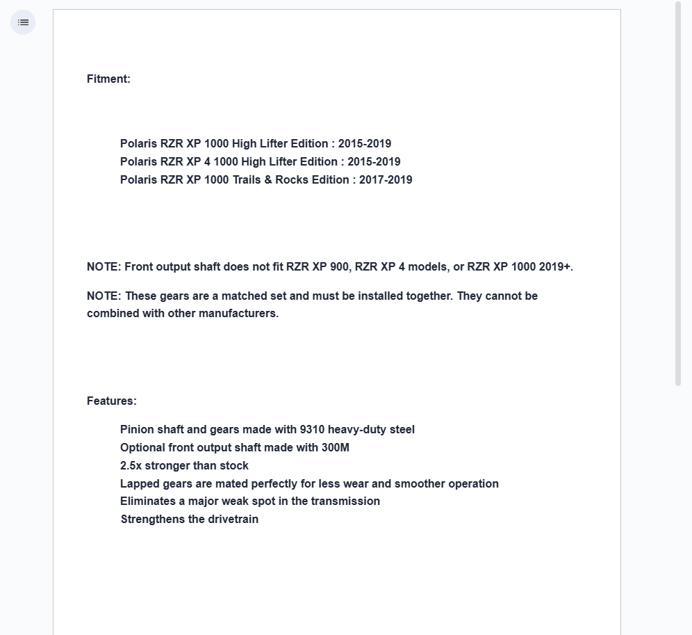 SuperATV’s Pinion Shaft and Snorkel Gear Kit gives your Polaris RZR the strength it needs to keep going. We build ours with them same high-strength gear material used in NASCAR, 9310 alloy steel, to make sure it can withstand all the abuse and torque you throw at it. We test EVERY set of gears to make sure they are perfectly mated and running smooth.
