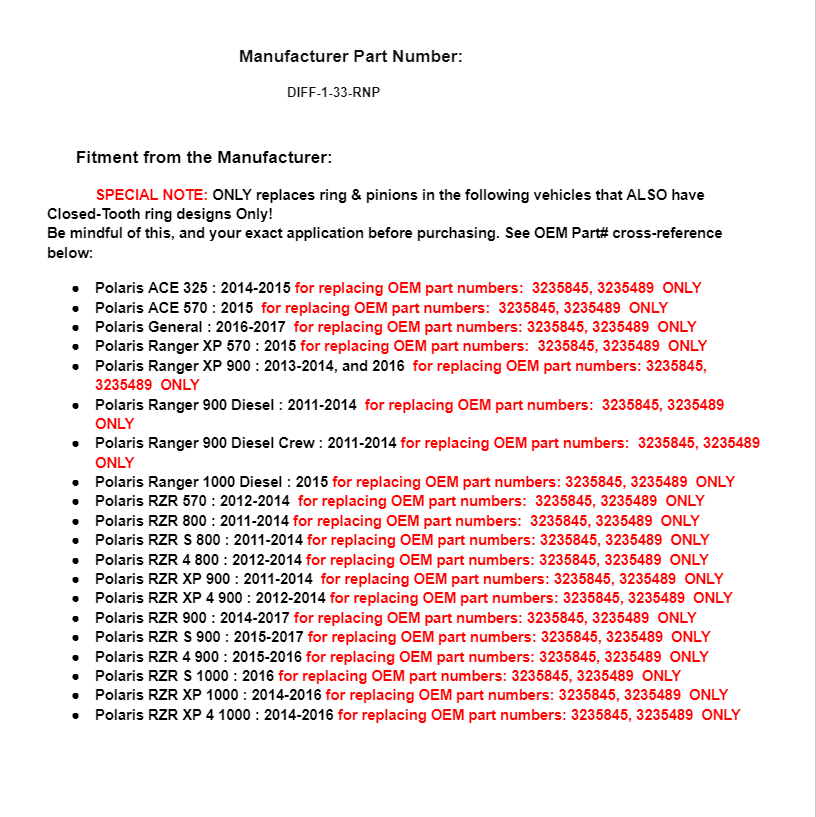 - Polaris Ranger 900 Diesel : 2011-2014 for replacing OEM part numbers: 3235845, 3235489 ONLY