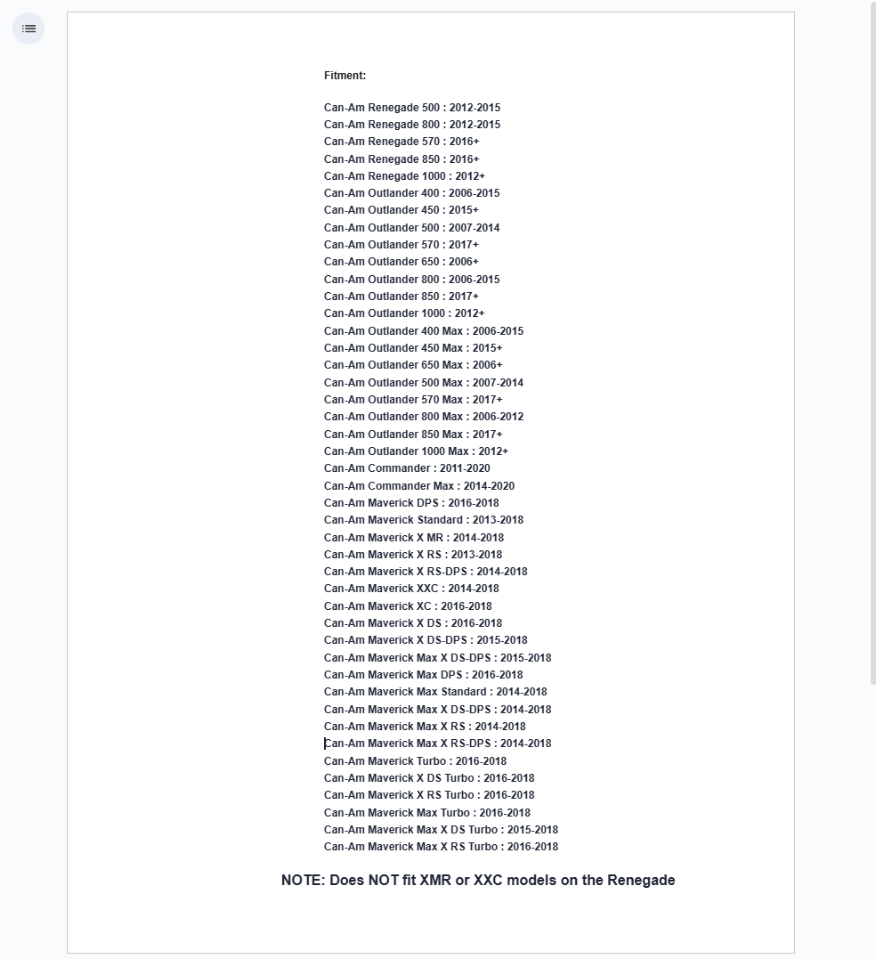 NOTE: Does NOT fit XMR or XXC models on the Renegade