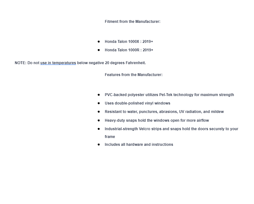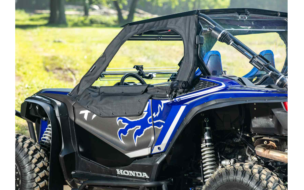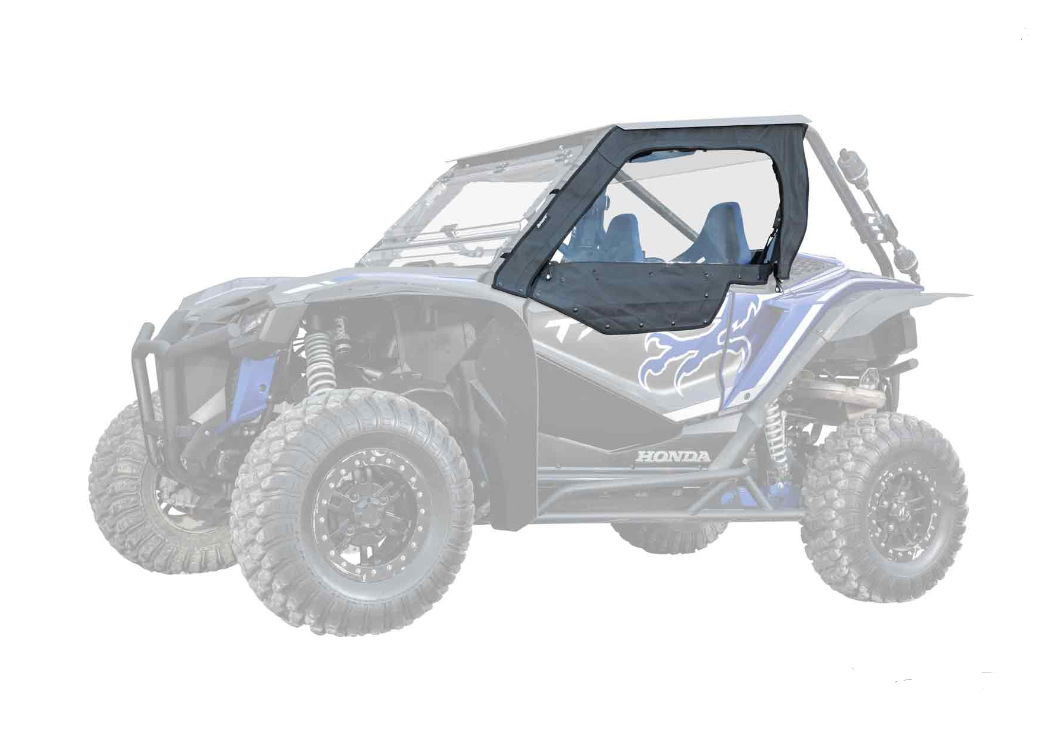 These Talon 1000 upper doors are made from PVC-backed polyester that is resistant to punctures, abrasions, and mildew. Our Pel-Tek technology makes them heavy duty and great for protection against the elements and debris. How do we make them? All of the material is CNC cut for a tight fit that won’t stretch over time. We also use a premium stitching technique that’s better than standard hemming—our high-quality thread is some of the thickest in the industry.