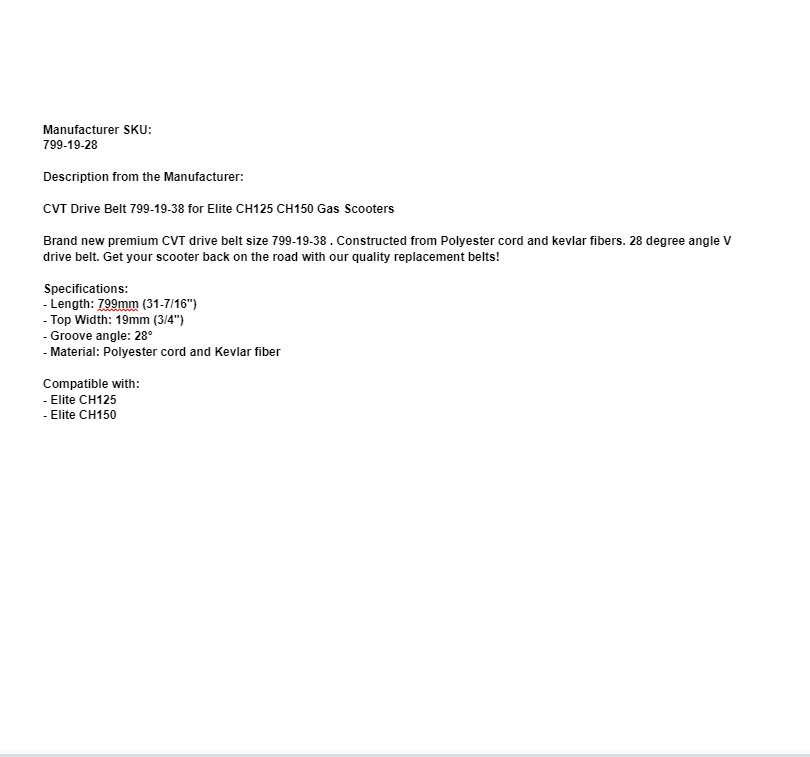 Brand new premium CVT drive belt size 799-19-38 . Constructed from Polyester cord and kevlar fibers. 28 degree angle V drive belt. Get your scooter back on the road with our quality replacement belts!