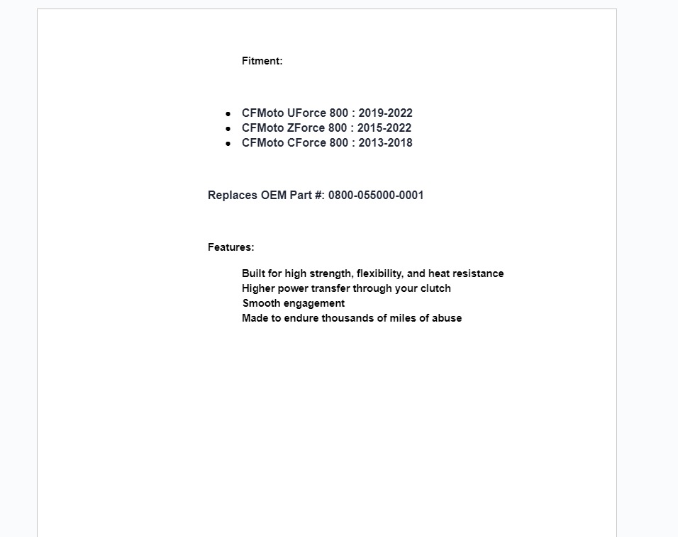 The workday is long, but your CFMOTO UForce is always up for the job—until that OEM belt burns up, that is. Replace your underperforming belt with a Heavy-Duty CVT Drive Belt from SuperATV to get the most out of your machine. Our belts are designed to work as hard as your UForce does without slipping or breaking. That means less downtime, more productivity, and a smoother ride, every time.