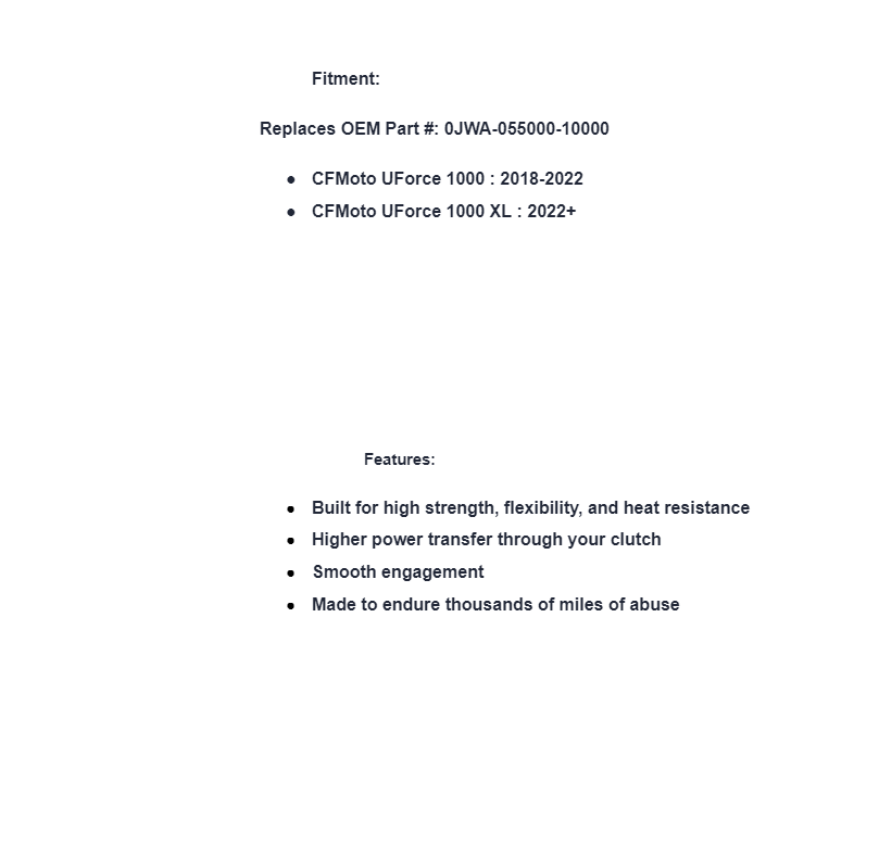 The workday is long, but your CFMOTO UForce is always up for the job—until that OEM belt burns up, that is. Replace your underperforming belt with a Heavy-Duty CVT Drive Belt from SuperATV to get the most out of your machine. Our belts are designed to work as hard as your UForce does without slipping or breaking. That means less downtime, more productivity, and a smoother ride, every time.