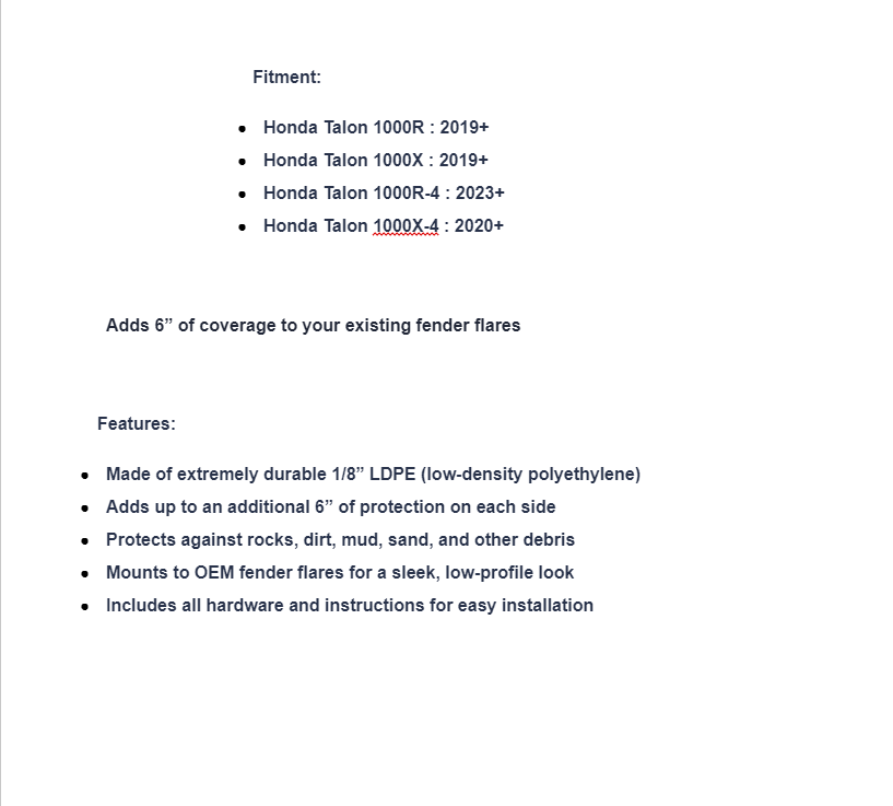 Just because you fly through the dirt with your Honda Talon 1000, it doesn’t mean dirt has to fly at you. Put SuperATV’s Honda Talon 1000 Low Profile Fender Flares on your machine and put them to the test. They’ll help keep whatever your tires kick up out of your cab and help your machine stay cleaner for longer. The low-profile fender flares extend your existing fender flares an extra 6” and adds to the sporty look of your Honda Talon.