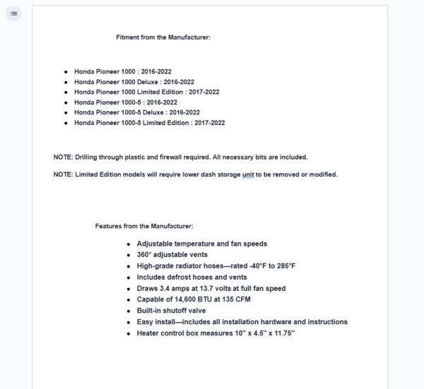 You need SuperATV’s Cab Heater because your Honda Pioneer 1000 is made to ride in the winter even if you’re not. It draws engine heat directly from the coolant lines to heat your cab just like a traditional car heater. Install is easy—we include hoses, drill-bits, and Pioneer-specific mounting plates to make it as easy as possible to get your heater up and running. With the unit mounted between the seats under the dash, you get balanced cab heating right where you want it. With adjustable temperature, and adjustable fan speeds, winter might just become your favorite time to ride.
