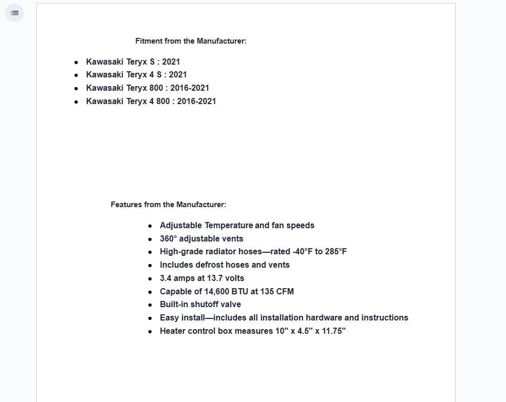Our under-dash cab heater pulls heat directly from your engine. That means the longer you ride, the more comfortable you’ll be. This kit also uses high-grade radiator hoses rated from -40°F to 285°F, so no matter how cold it is outside or how hot your engine gets, your Kawasaki heater can handle it.