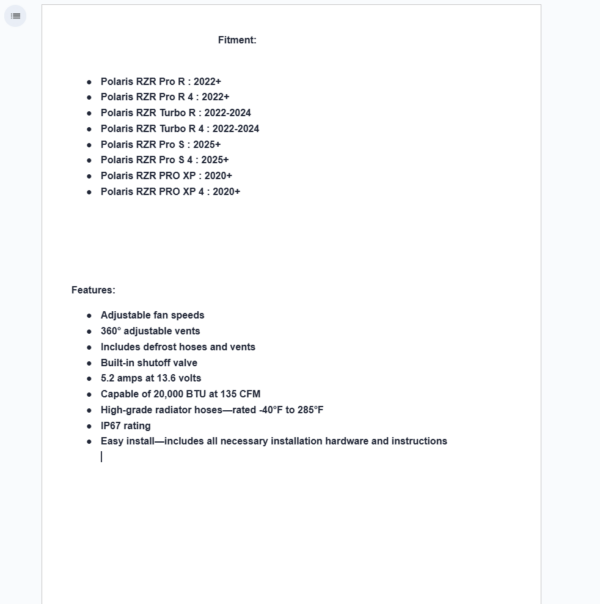 Cold rides can ruin the fun. Keep every rider warm with SuperATV’s In-Dash Cab Heater for the Polaris RZR Pro R. It installs right in your dash to stay out of the way while pumping out plenty of warmth. With well-placed hoses and vents, you’ll stay comfortable no matter how low the temperature drops.