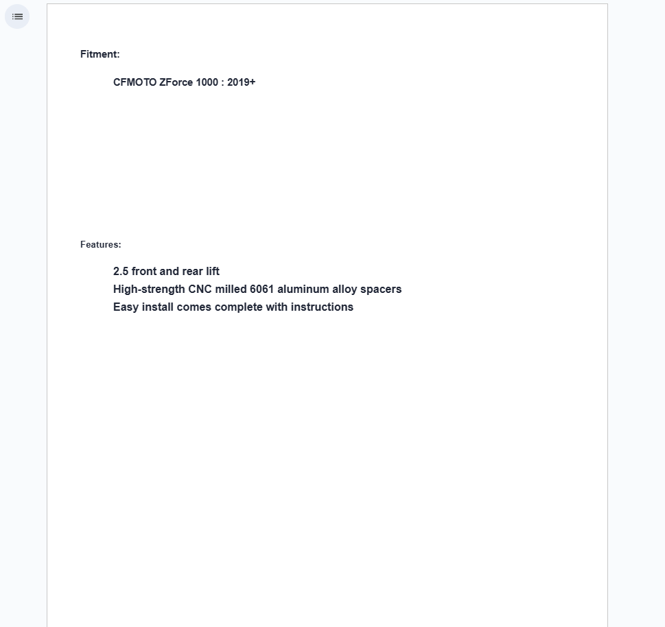 What can SuperATV’s 2.5” Lift Kit for the CFMOTO ZForce 1000 do for you? Our true 2.5” lift kit gives you clearance to roll through tougher trails and over bigger obstacles. A little lift makes for an overall better ride. Installation is quick and easy and can be completed solo.