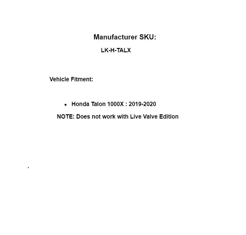 | Honda | Talon 1000X-4 | SXS10S4 FOX Live Valve | 2020 | |