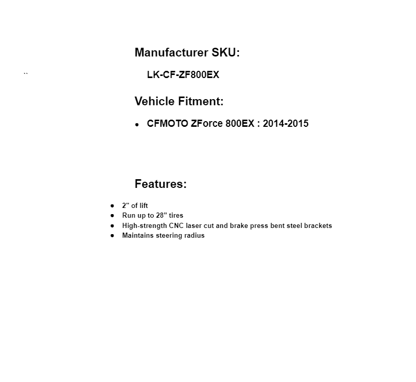 SuperATV 2” Lift Kit for CFMOTO ZForce 800EX (2014-2015)