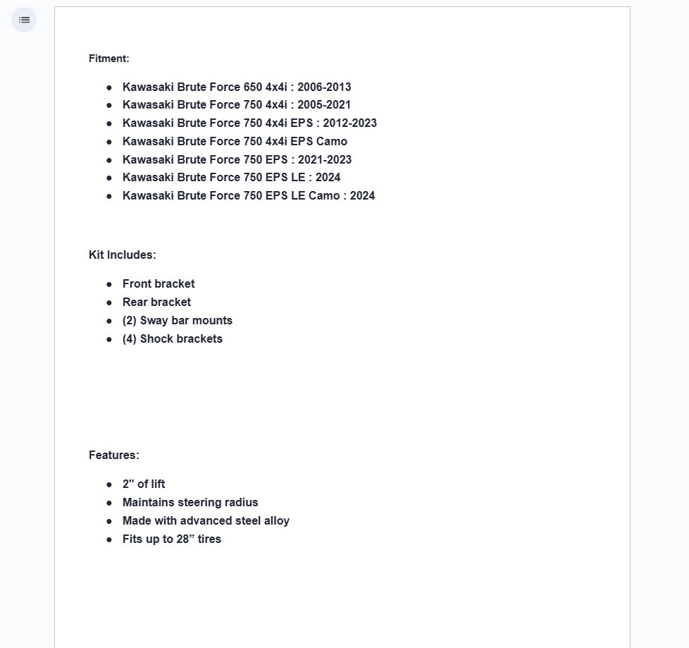 Stop worrying about bumpy trails with SuperATV’s Kawasaki Brute Force 2” Lift Kit. More ground clearance means you’ll get hung up on fewer obstacles and keep your momentum going. The lift brackets are made from an advanced steel alloy, ensuring they can endure any obstacle. Plus, you’re getting more room for larger tires.
