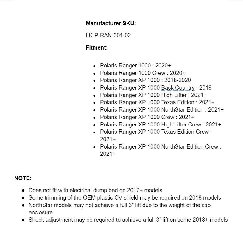 - Shock adjustment may be required to achieve a full 3” lift on some 2018+ models