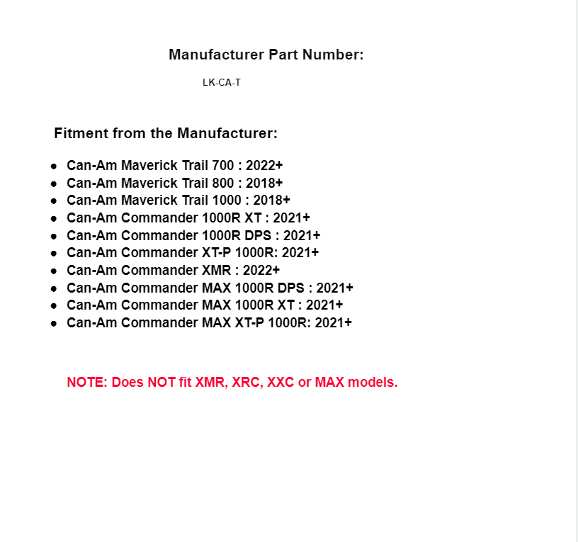 NOTE: Does NOT fit XMR, XRC, XXC or MAX models.