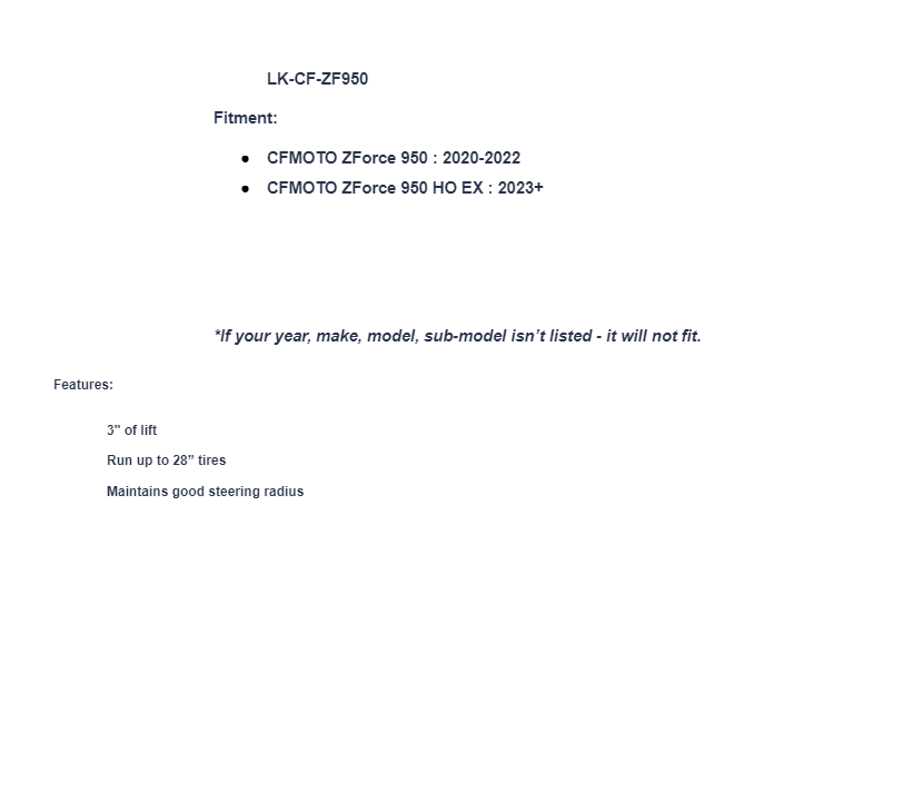 Ride where you never could before by installing SuperATV’s 3” Lift Kit on your CFMOTO ZForce 950. No matter where you ride, a quality lift will completely transform your experience. With some extra ground clearance, you’ll be able to take on the roughest terrain and make it look easy. Get ready to take the trail less traveled, because no good story ever started with taking the easy route.