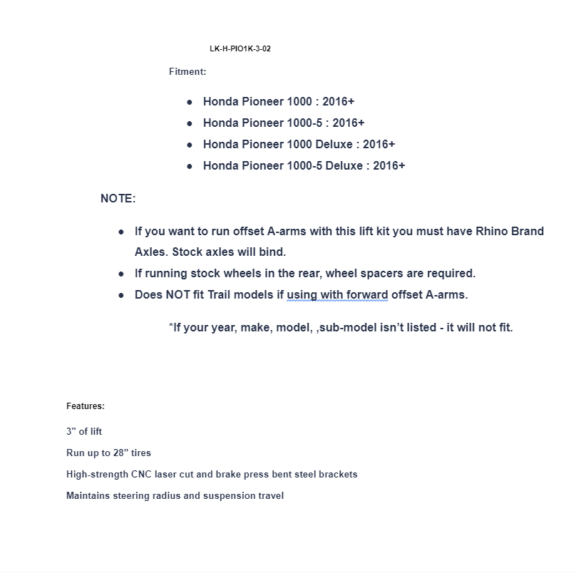 - If you want to run offset A-arms with this lift kit you must have Rhino Brand Axles. Stock axles will bind.