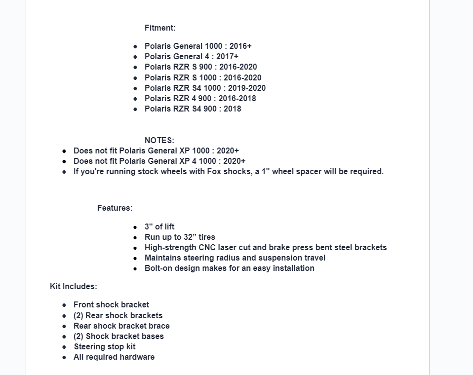 If you want a lift kit that measures true to size, withstands all levels of trail torture, and outperforms everything else in its class, you need SuperATV’s 3” Lift Kit. It gives your Polaris General a full three inches of additional ground clearance, letting you cross larger obstacles and run bigger tires. No matter what kind of riding you’re into, you can’t go wrong with a SuperATV lift kit.